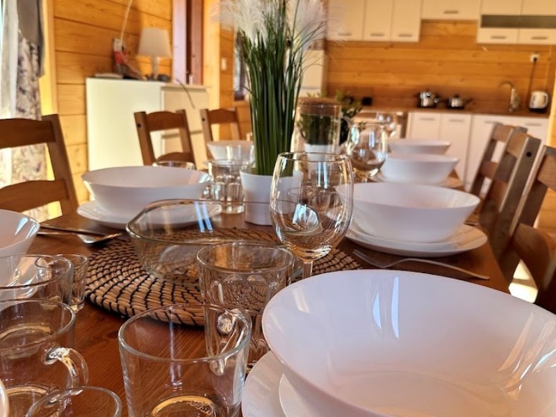 Drugi dom, nieco większy, o powierzchni około 90 m², oferuje podobny układ z salonem, łazienką i dwiema sypialniami, z czego jedna mieści pięć, a druga cztery osoby. Dzięki takiemu rozkładowi osada może komfortowo pomieścić większe grupy, co znacząco zwiększa potencjał wynajmu.