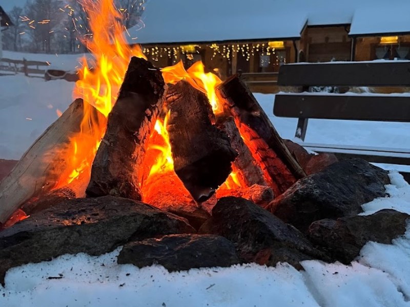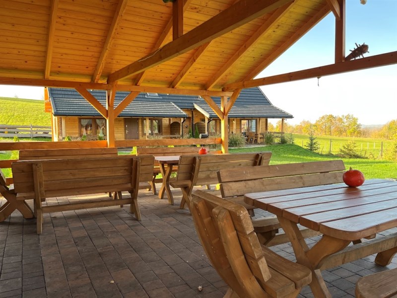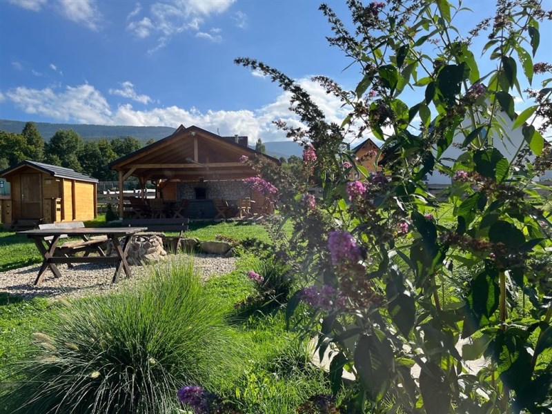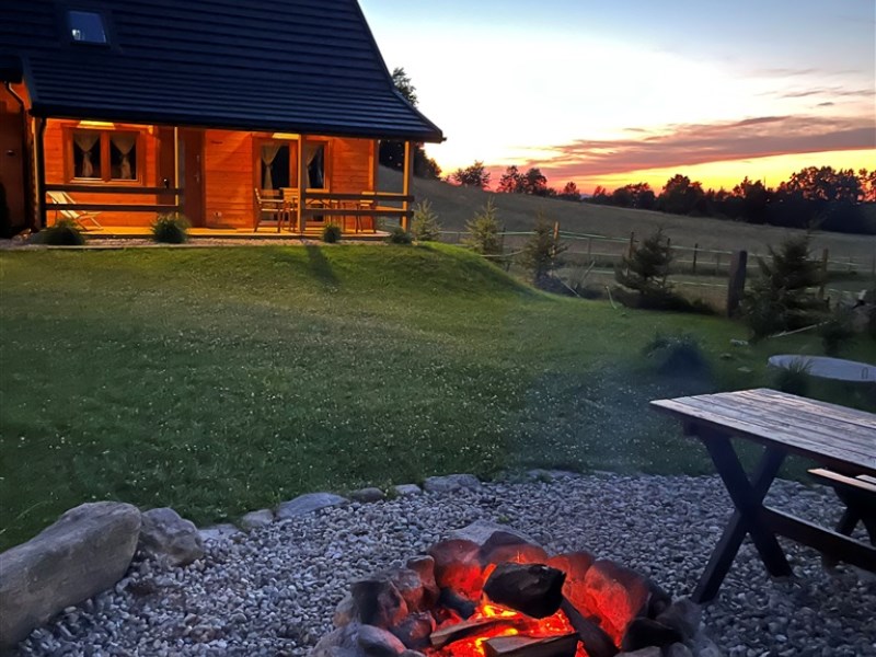 Teren posesji został zaaranżowany z myślą o wypoczynku i relaksie gości. Znajduje się tu miejsce na grilla pod zadaszoną wiatą oraz wydzielony krąg ogniskowy, idealny do spędzania letnich wieczorów w otoczeniu natury. Całość położona jest w cichej, malowniczej okolicy, z pięknymi widokami na pobliskie góry, co tworzy idealne warunki do wypoczynku z dala od miejskiego zgiełku.