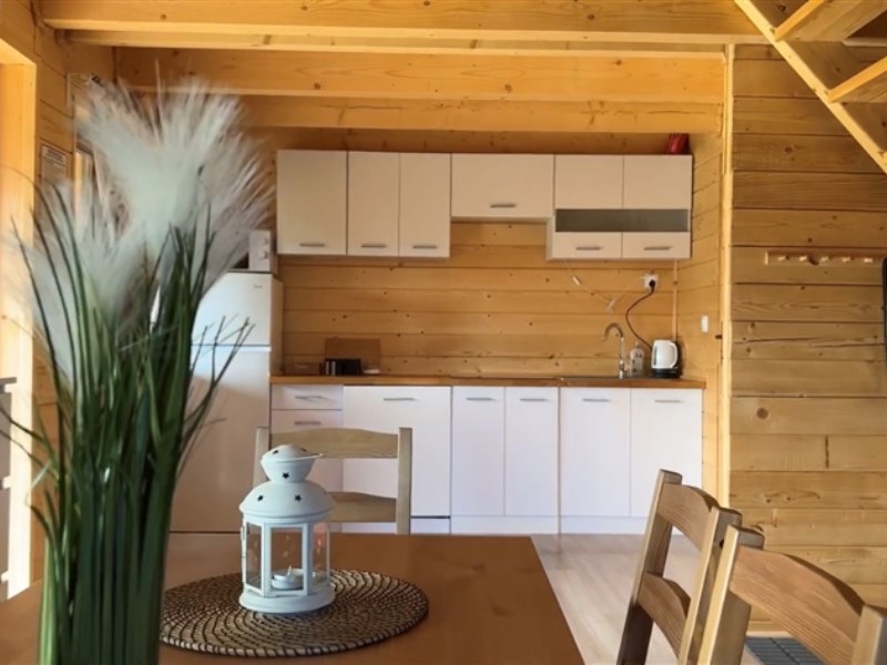 W pierwszym domku o powierzchni około 80 m² znajduje się przestronny salon z aneksem kuchennym i miejscem do spania, łazienka oraz dwie sypialnie – jedna pięcioosobowa i jedna trzyosobowa.