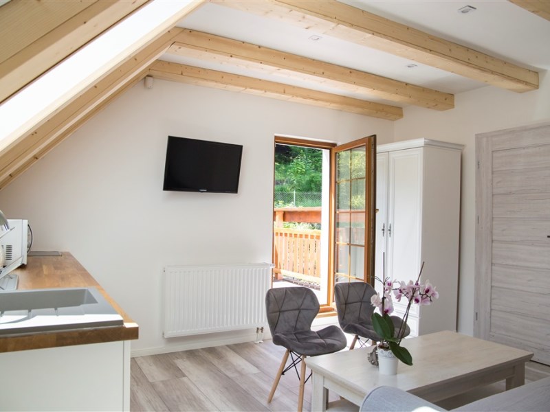- apartament 6-osobowy, 45m2 składający się z salonu z 2-osobową sofą i aneksem kuchennym,