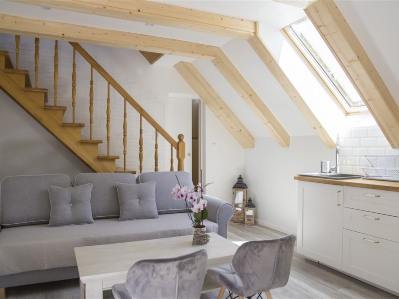 - apartament 6-osobowy, 45m2, 2-poziomowy, składający się na dole z salonu z 2-osobową