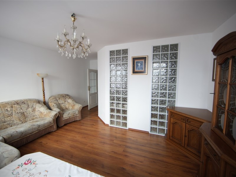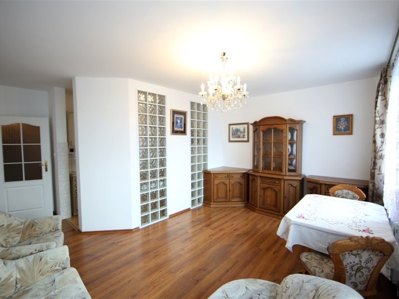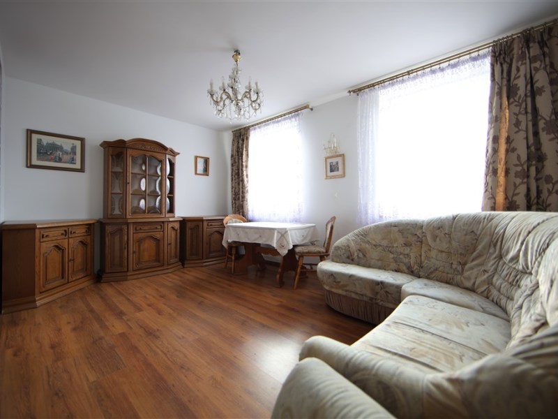 - przestronny, jasny, umeblowany salon z dużą sofą narożną, fotelem, stołem z krzesłami oraz solidnymi meblami z litego drewna. Z dużych okien otwarty widok na majestatyczne Karkonosze.