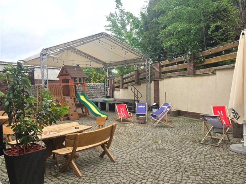 Z tyłu budynku znajduje się przestrzeń, którą w sezonie letnim można zagospodarować jako ogród letni lub ogródek piwny.