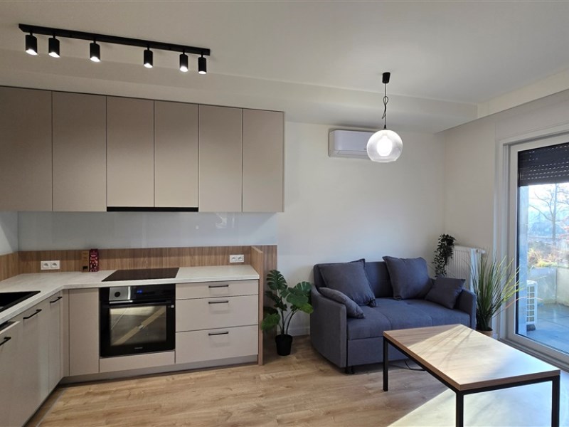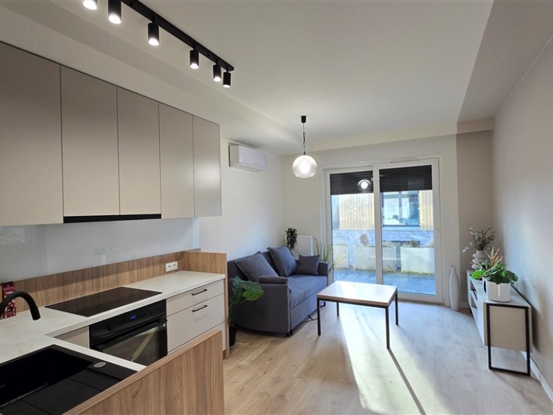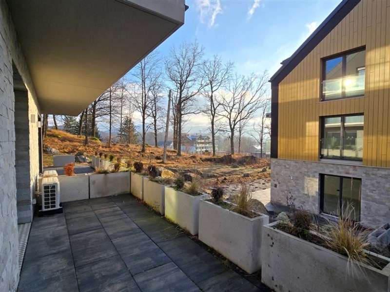 Mieszkanie znajduje się na parterze budynku. Powierzchnia 37,1 m2 obejmuje salon z wyjściem na taras, z którego rozpościera się widok na góry i park ze starodrzewem. Gustowny salon łączy się z praktycznie urządzonym aneksem kuchennym. Obok salonu znajduje się klimatyczna sypialnia, następnie łazienka z prysznicem i pełną zabudową. W przedpokoju wykonano przestronną garderobę.